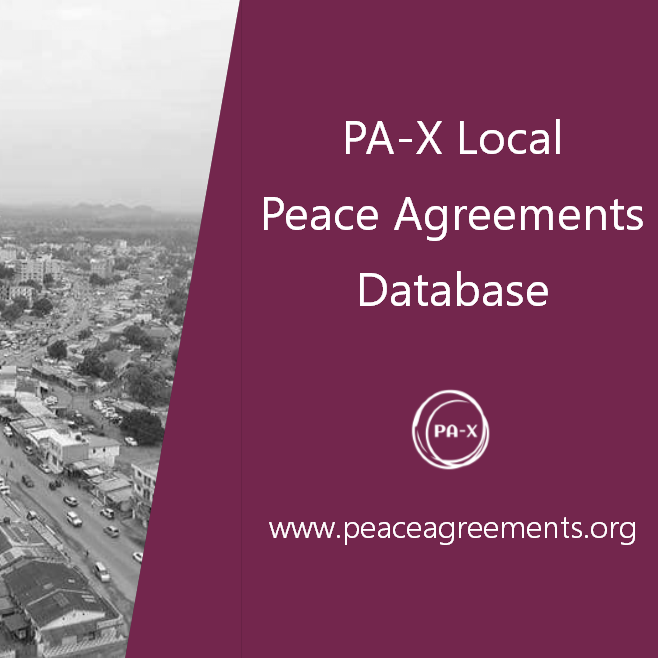 PA-X Local is the first open-access database of written local peace agreements from across a global set of conflict-affected contexts. The local peace agreements included are publicly available written agreements between locally based and other actors, which address local conflict-generating grievances only within a part of the wider conflict-affected area. PA-X Local offers a glimpse into the processes and outcomes of local peacemaking, including information on how certain local processes may relate to national peace processes.
